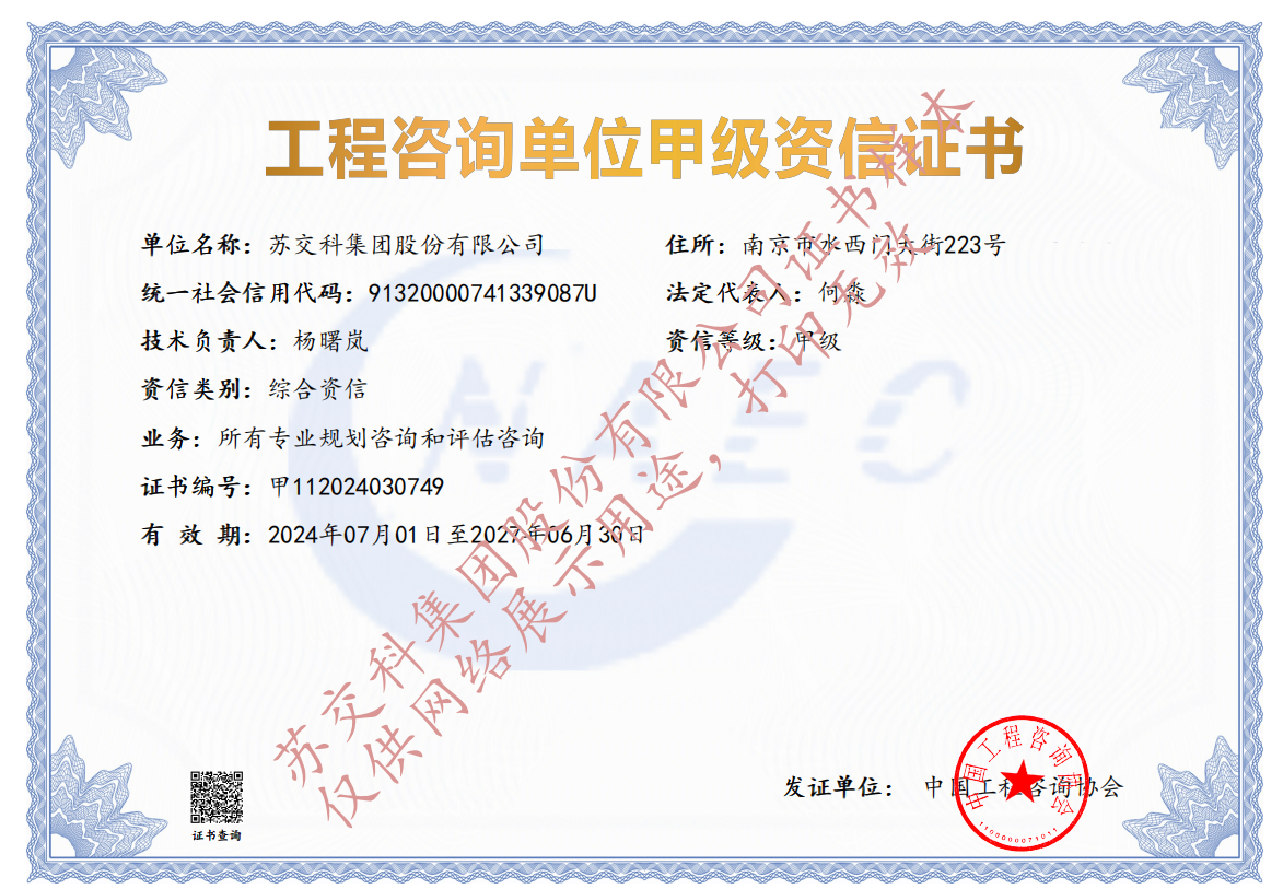 蘇交科擁有工程行業(yè)各領域甲級資質,包括城鄉(xiāng)規(guī)劃甲級資質;工程咨詢綜合甲級資質;工程咨詢專業(yè)甲級資質(公路、生態(tài)建設和環(huán)境工程、水文地質、工程測量、巖土工程、城市規(guī)劃、鐵路、城市軌道交通、港口河海工程、市政公用工程(市政交通、給排水)、水利工程、旅游工程);工程設計綜合甲級資質;工程勘察綜合類甲級資質;測繪甲級資質;公路工程和市政公用工程總承包一級資質;公路工程、水運工程、市政公用工程監(jiān)理甲級資質;公路工程甲級、公路工程交通工程專項、水運工程材料甲級和水運工程結構甲級試驗檢測資質。